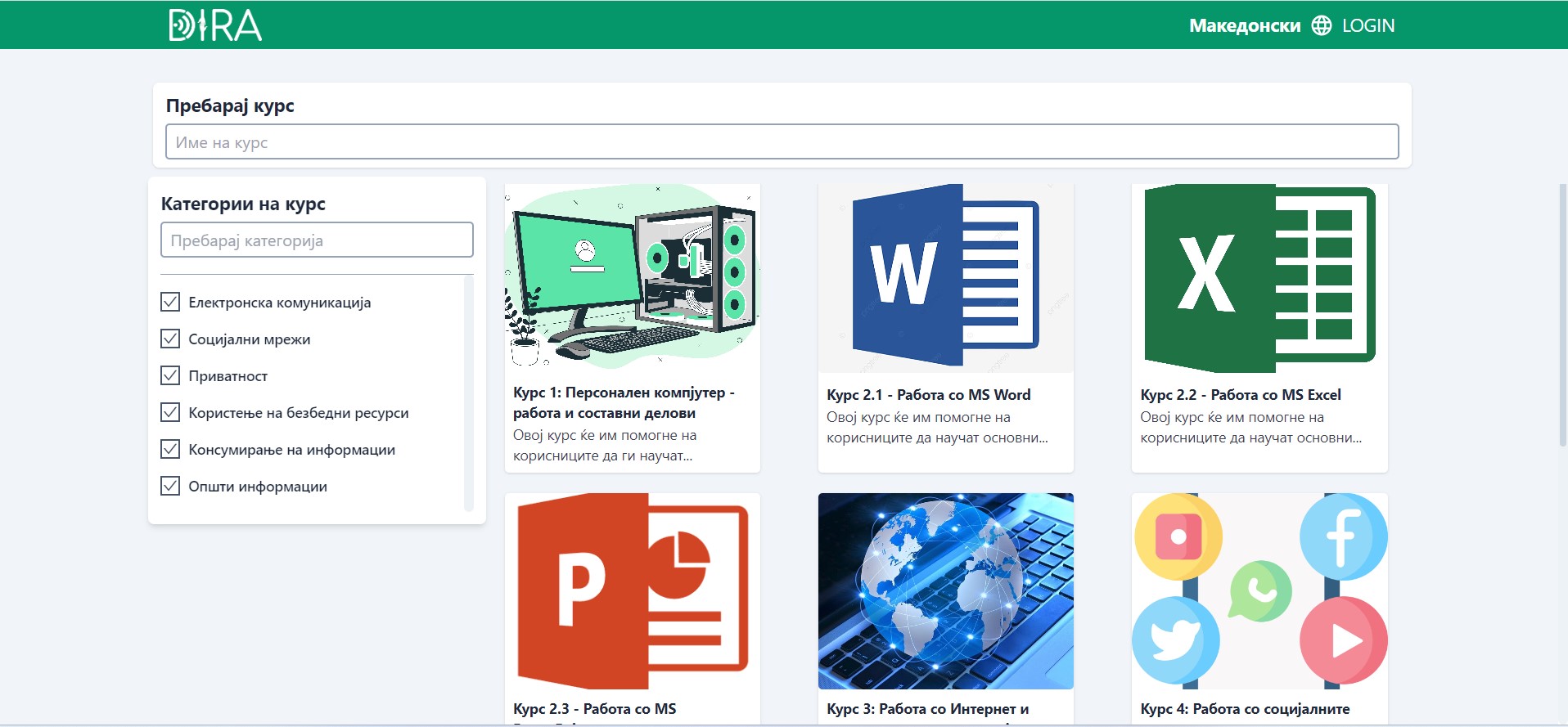 Платформата за онлајн учење содржи 6 курсеви, и тоа: